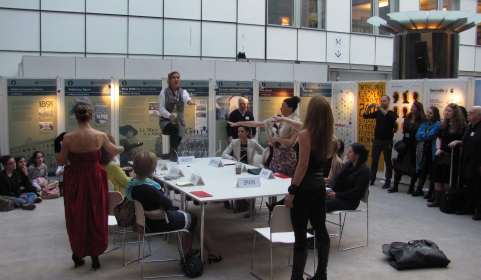 Η Λυσιστράτη, αυτή η ιδεαλίστρια, στο έργο του Αριστοφάνη, καταφέρνει τελικά να πραγματοποιήσει το όνειρο της. Χάρη στο «λαμπερό και εύθραυστο» σχέδιο της ηρωίδας, στο τέλος του έργου η συμφιλίωση είναι ο μεγάλος νικητής. Με ποιον όμως συνδιαλέγεται η Λυσιστράτη, αν η πλοκή της κωμωδίας του Αριστοφάνη μεταφερθεί στην κάρδια της Ευρώπης; Ποιος είναι ο στόχος της μέσα στην έδρα του Κοινοβουλίου; Οι γυναίκες που καλεί θα μπορούσαν να είναι οι εκπρόσωποι των χωρών τις Μεσόγειου που έχουν πληγεί από την οικονομική κρίση. Και η ειρήνη που θέλει να επιβάλει είναι η αφύπνιση της συνείδησης τους. Και ο πόλεμος; Μήπως είναι αυτό που στέκεται πάνω από τα κεφάλια όλων μας και φοβόμαστε πότε θα ξεσπάσει;
