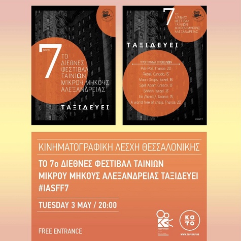 Το Φεστιβάλ Αλεξάνδρειας ταξιδεύει: Την Τρίτη 3 Μαΐου 2022 η Κινηματογραφική Λέσχη Θεσσαλονίκης προβάλλει 7 ταινίες που έχουν βραβευθεί στο Φεστιβάλ Αλεξάνδρειας. Η προβολή θα γίνει στον πολυχώρο Pikap Kato, Ολύμπου 57, στο κέντρο της Θεσσαλονίκης, στις 8.00 μ.μ. Μετά την προβολή θα ακολουθήσει συζήτηση με εκπρόσωπο της Κινηματογραφικής Λέσχης Αλεξάνδρειας. Η είσοδος είναι ελεύθερη.